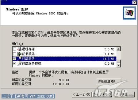 第三步:稍后会出现添加删除WINDOWS组件窗口,我们从中选择“终端服务”,然后点“下一步”进行安装。(如图1)这里要注意一点的是在安装过程中需要我们插入WINDOWS 2000SERVER系统光盘到光驱中。