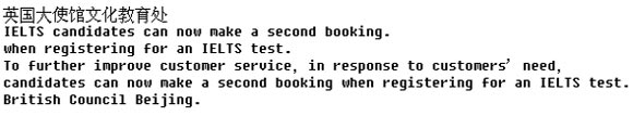 日前,考生可以开始报考明年的雅思考试了。此次考试日期的安排和出台,继续秉承一切服务于考生的原则,在全年安排有48个考试日期,分布于全国32个城市的35个考点进行。为了满足不同考生的需求,除周六考试之外,每个月还特别安排了一次周四考试。采集者退散